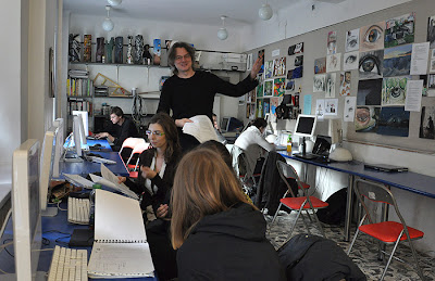 Zajęcia w pracowni grafiki. Robert Manowski opowiada o dyplomach, pokazuje dyplomowe filmy oraz ...historyczne już filmy propagandowe.